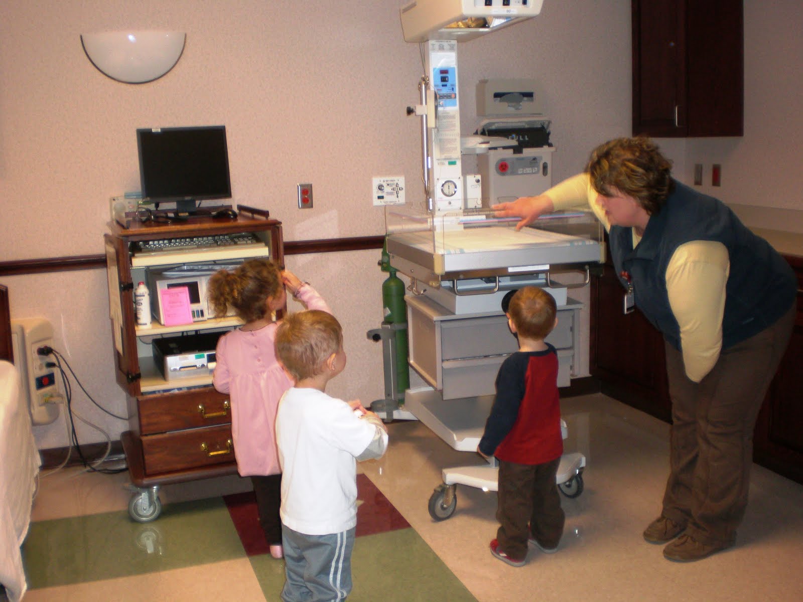 After a corny video, the instructor took Fischer and the other 2 kids in the class for a tour of a hospital room "like the one Mom will stay in for a couple days when the baby's born." This was all fine and dandy, except in the video, when they spoke about Mom's hospital room, they pointed out the buttons on Mom's bed that make it go up and down (why would they do that?!?!)...needless to say, I didn't feel too bad when Fischer quickly found and pressed the nurse's call button! How could we scold him when he was checking out something the video had just pointed out for him!